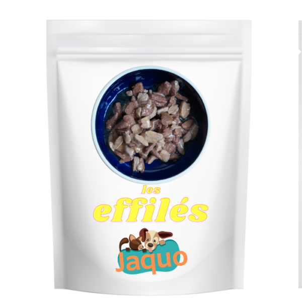 (« Les Effilés » : menus gourmands et charnus au poulet arrosés de sauce /Vendus en pochons de 85 grammes / recette élaboré par des Vétérinaires).
